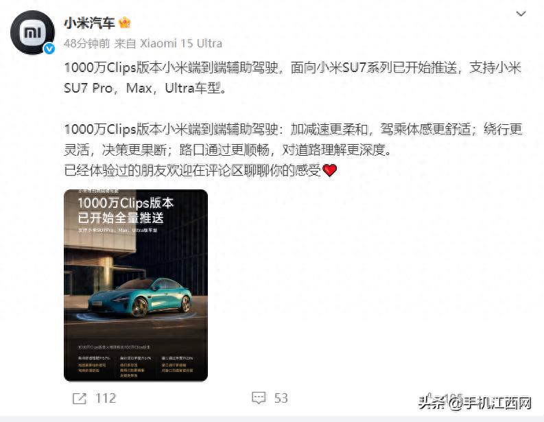 7月29日,@小米汽车 宣布:1000万Clips版本小米端到端辅助驾驶,面向小米SU7系列已开始推送,支持小米SU7 Pro,Max,Ultra车型。