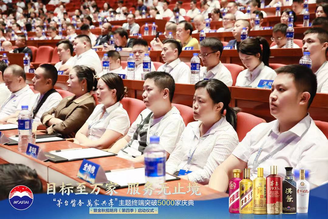贵州省内5A级以上主题终端商户及媒体代表等500余人在遵义主会场参会,全国各省区共设置40余个分会场,5000余家主题终端店以线上直播形式参会,共庆“茅台酱香·万家共享”的荣耀时刻。
