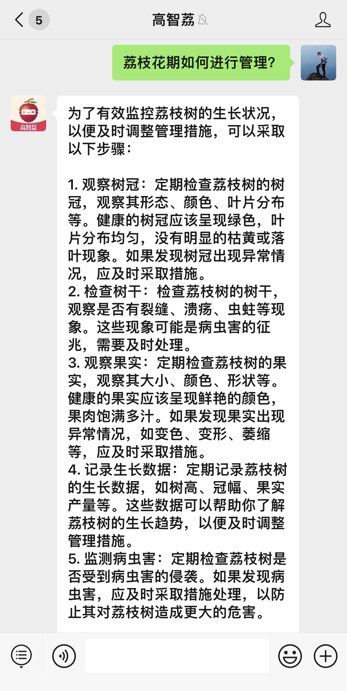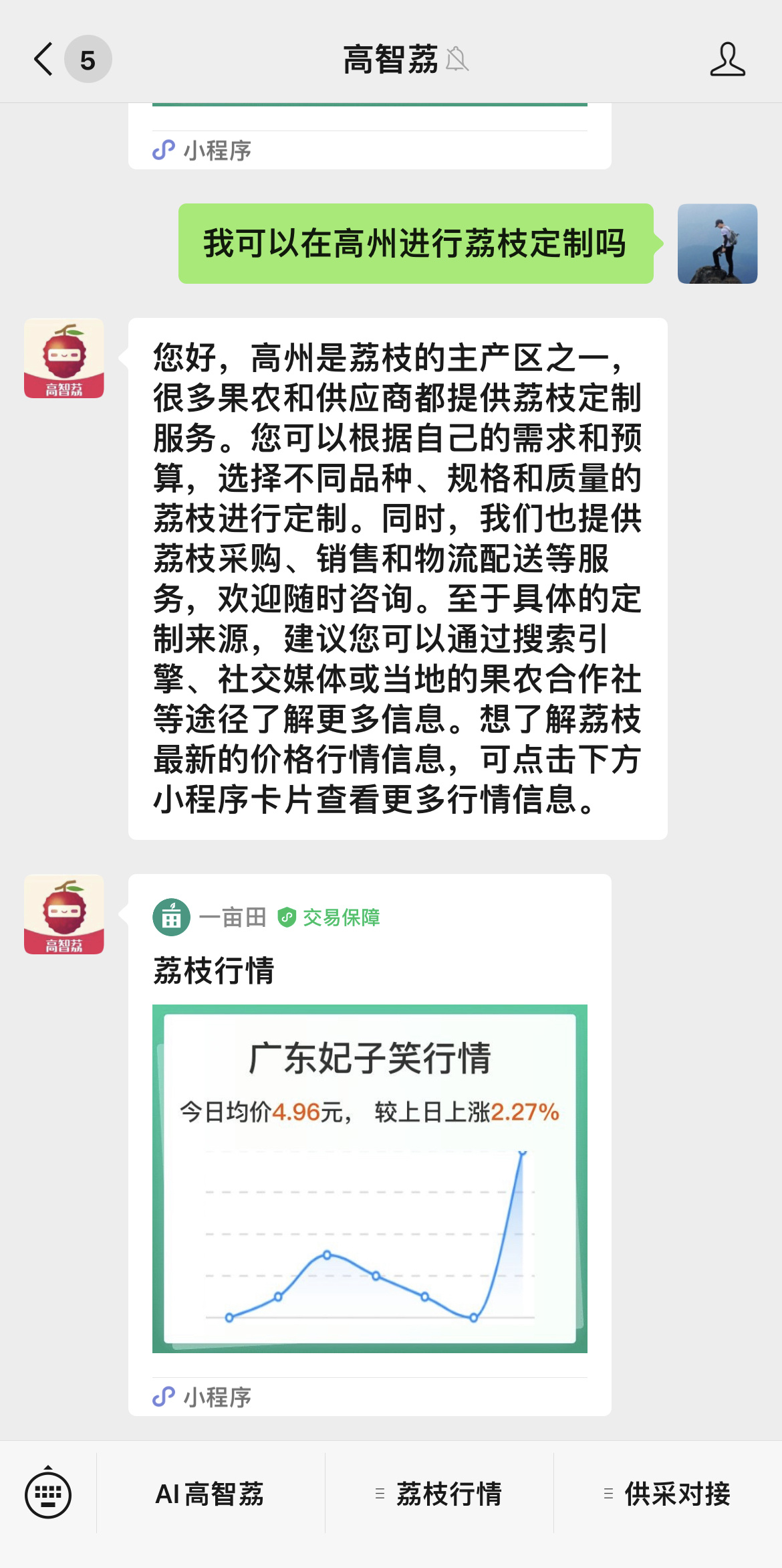 据介绍,“高智荔”是以AI大模型为技术底座,输入海量高州荔枝知识,并运用一亩田荔枝行业知识图谱和行情大数据体系,构建的高州荔枝Al智能对话机器人。用户只需要在微信公众号“高智荔”的聊天对话框输入需要咨询的内容,即可一键获得详细解答。