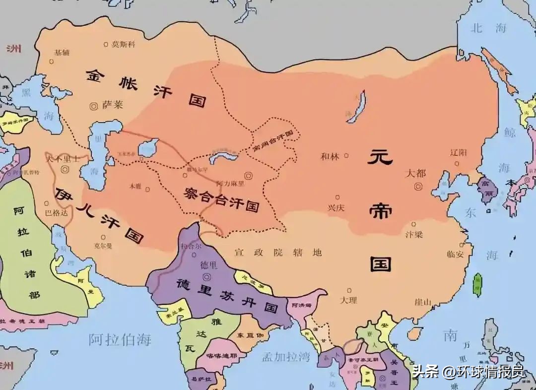 1271年,成吉思汗之孙忽必烈建立元朝,并于1279年彻底消灭南宋,完成中国统一。而此时遍布在中亚和西亚的金帐、伊尔等汗国渐渐走向独立。
