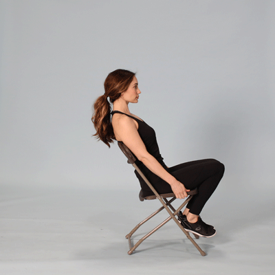 屈膝坐在椅子上,双脚踩在椅子下端,背部贴于靠背。