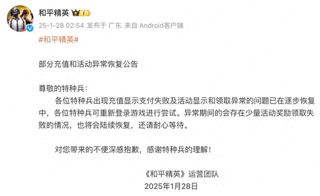 1月28日凌晨,腾讯手游《和平精英》运营团队发布公告称,各位玩家出现充值显示支付失败及活动显示和领取异常的问题已在逐步恢复中,玩家可重新登录游戏进行尝试。异常期间的会存在少量活动奖励领取失败的情况,也将会陆续恢复。