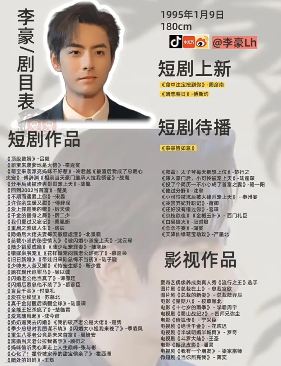 李豪河南焦作人,1995年1月9日出生,身高180cm,毕业于浙江传媒学院,早期曾出演过长剧《总裁在上》2023年转入短剧行列,友友们现在也是很认可他的演技!