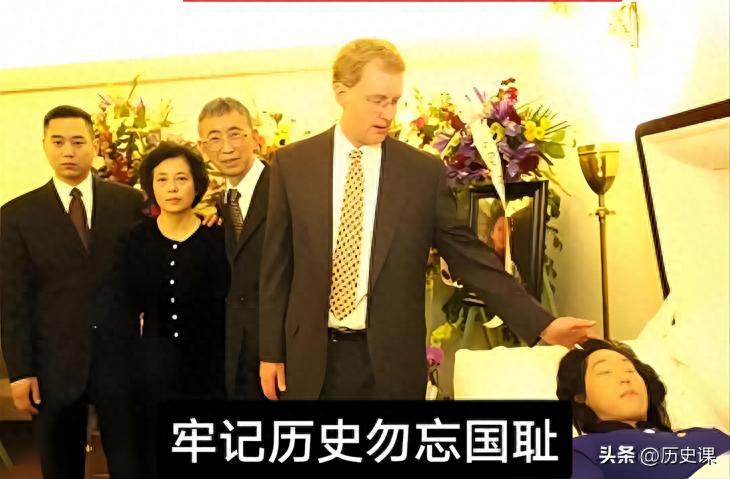 2004年,张纯如追悼会上最后的留影,这是她的遗容。张纯如安静地躺在棺椁里,好像熟睡了一样,永远地长眠了。站在张纯如身边的是她的丈夫布瑞特·道格拉斯,左边的三人是张纯如的父母和弟弟,他们是张纯如生前最亲近的人,前来送张纯如最后一程。