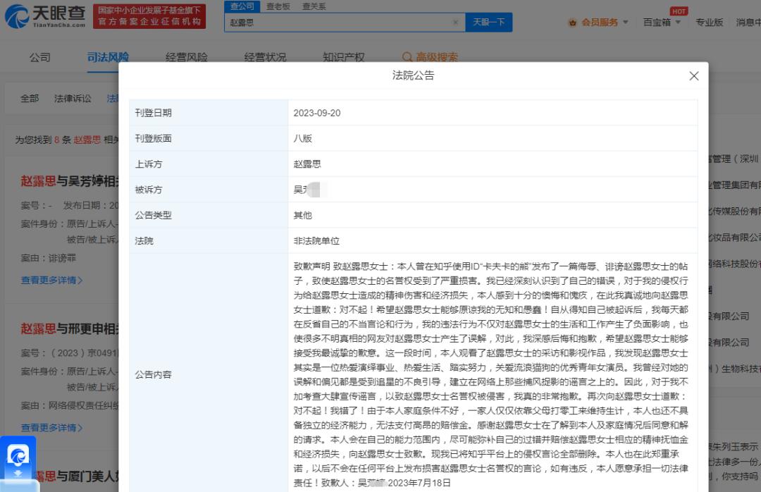 同日,天眼查APP,新增一则吴女士向演员赵露思致歉的公告。公告中称:其发布了一篇侮辱、诽谤赵露思女士的帖子,致使赵露思女士的名誉权受到严重损害。对此行为其认识到了自己的错误,对自己的侵权行为给赵露思造成的精神伤害和经济损失感到十分懊悔和愧疚,在此真诚地向赵露思女士道歉。