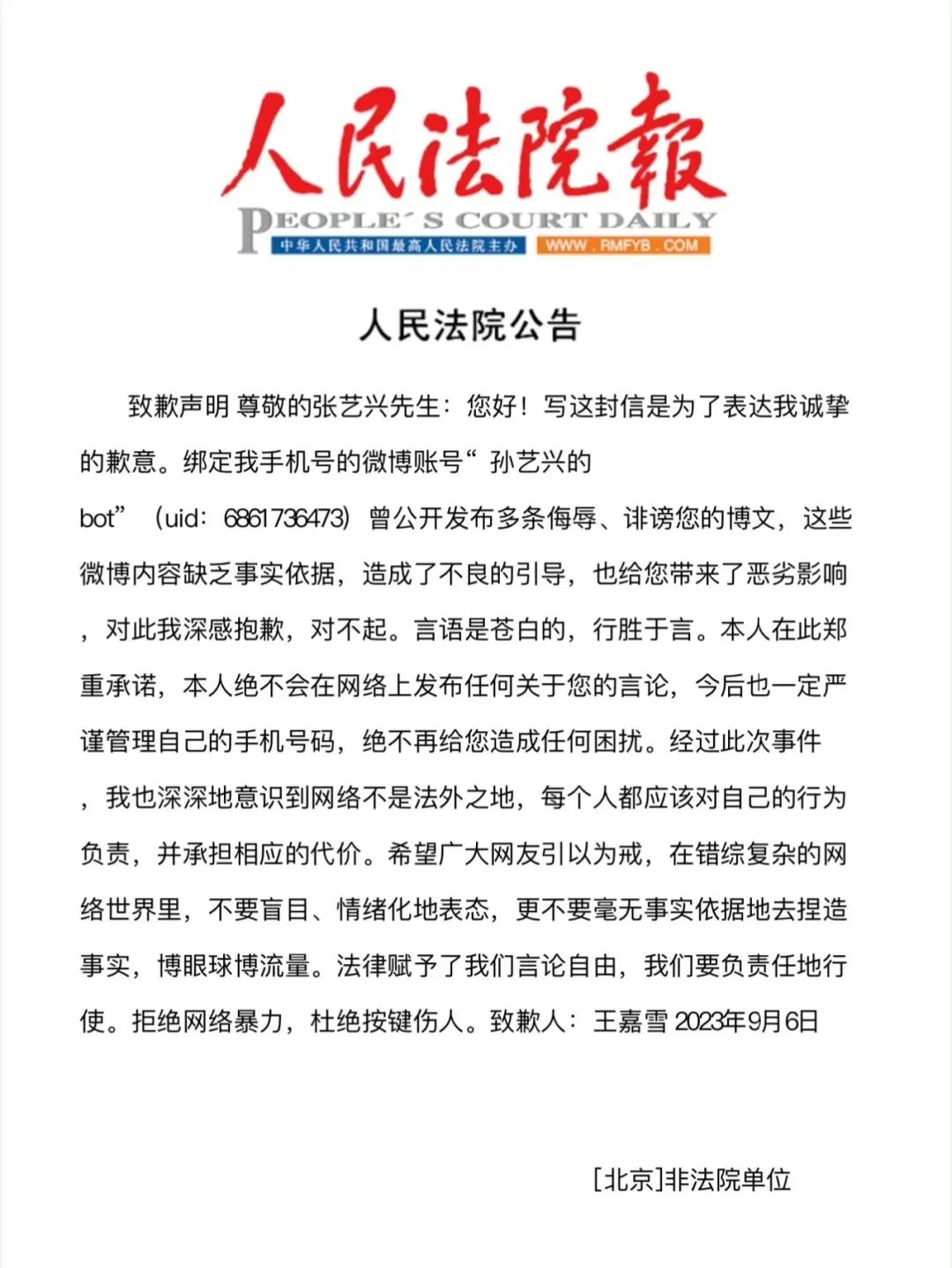 天眼查App显示,9月20日,法院刊登 “孙艺兴的bot”微博账号持有人王某某向@张艺兴 致歉的公告。王某某称,此前曾公开发布多条侮辱、诽谤张艺兴的博文,这些微博内容缺乏事实依据,造成了不良的引导,也给张艺兴带来了恶劣影响,对此深感抱歉,并郑重承诺绝不会在网络上发布任何关于张艺兴的言论,希望广大网友引以为戒,拒绝网络暴力,杜绝按键伤人。据悉,微博账号“孙艺兴的bot”粉丝过万,此前因嘲讽张艺兴引发关注,后账号被封。