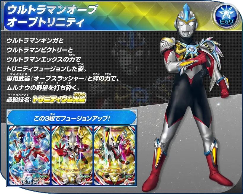 用赛文奥特曼和赛罗奥特曼的力量融合升级的形态。自如的使用父子相传的技能!《奥特格斗欧布》中作为主角形态登场。