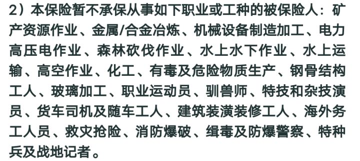 承保职业上,除了部分高危职业人群外,都可以投保,像外卖员、快递员等常见中高风险职业就可以投: