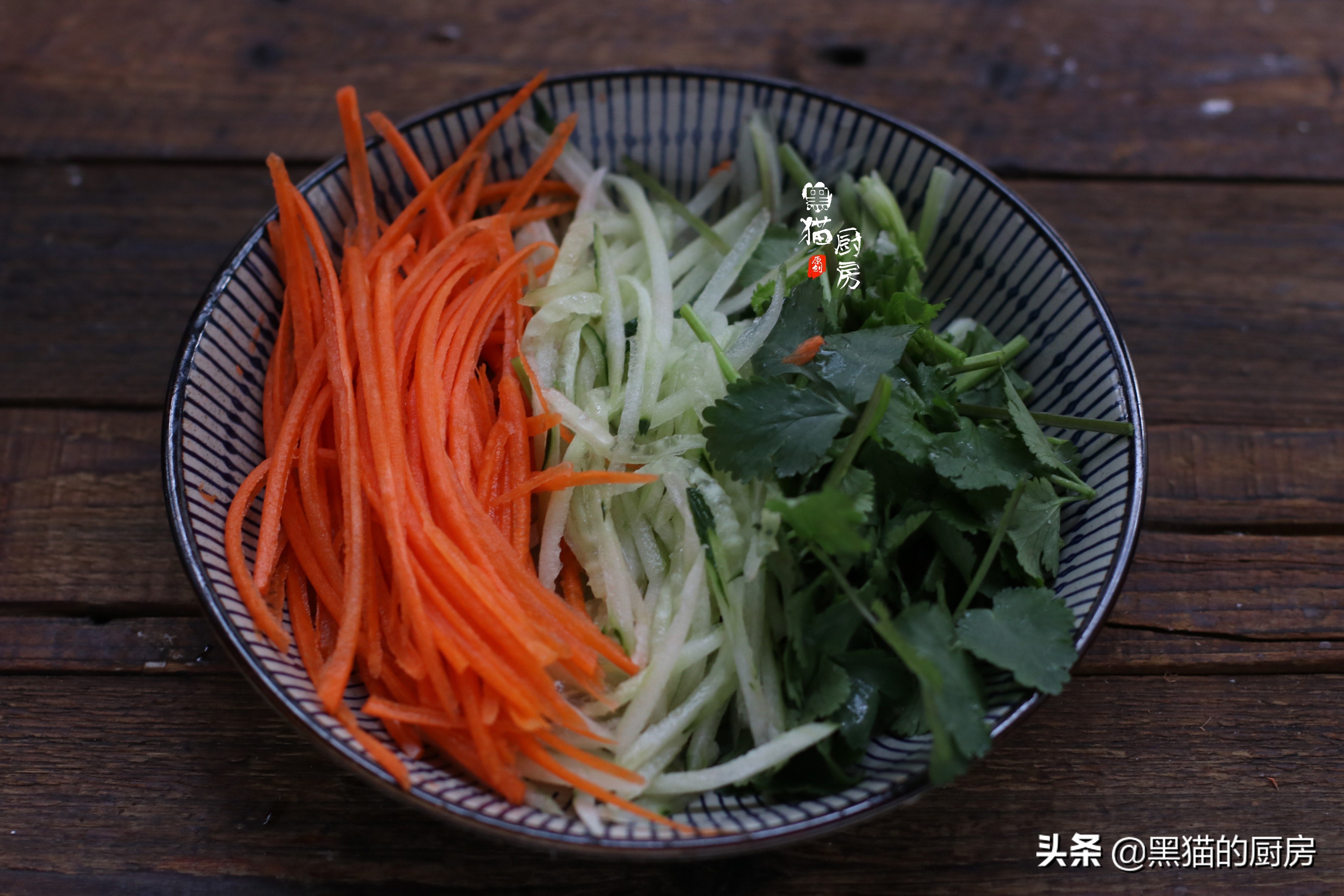 5.准备半根胡萝卜和黄瓜,用擦丝器擦成细丝,香菜洗干净,切成小段备用。