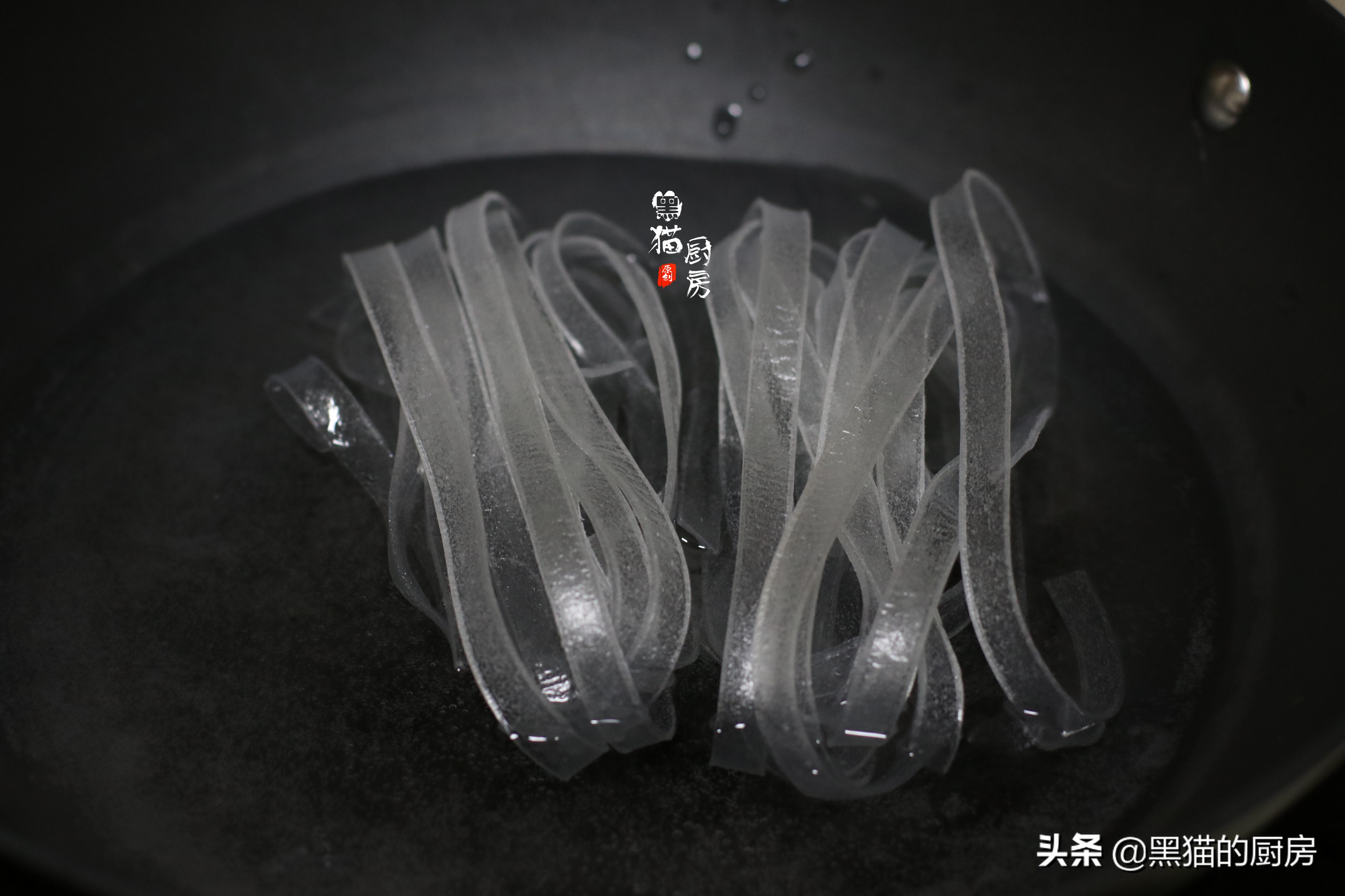 6.焖煮了8分钟左右,宽粉变透明而且富有弹性,中间完全没白点,就说明焖煮熟透了,把宽粉倒出来,放入凉水中冲洗。