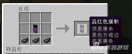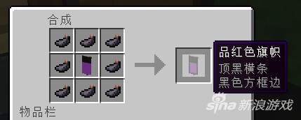 首先我们要准备一些做旗帜的材料,这些材料有羊毛、木棍和很多很多的墨囊。具体这里要使用品红色的羊毛六个,木棍一个就够了还有20个墨囊,具体步骤见下图: