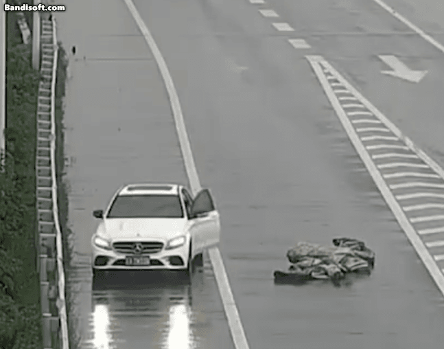 一名白衣女子推开车门,冒雨冲下车奋力拖拽,将厚重的雨布挪到应急车道,随即上车离开,全程用了不到1分钟。