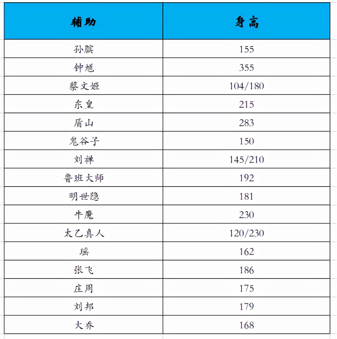 而软辅的身高就普遍比较矮小了,瑶才162CM,蔡文姬104CM,孙膑155CM。让人意外的是,游戏里让人感觉腿最长的大乔身高只有168,可能是腿长看起来就是高啊。