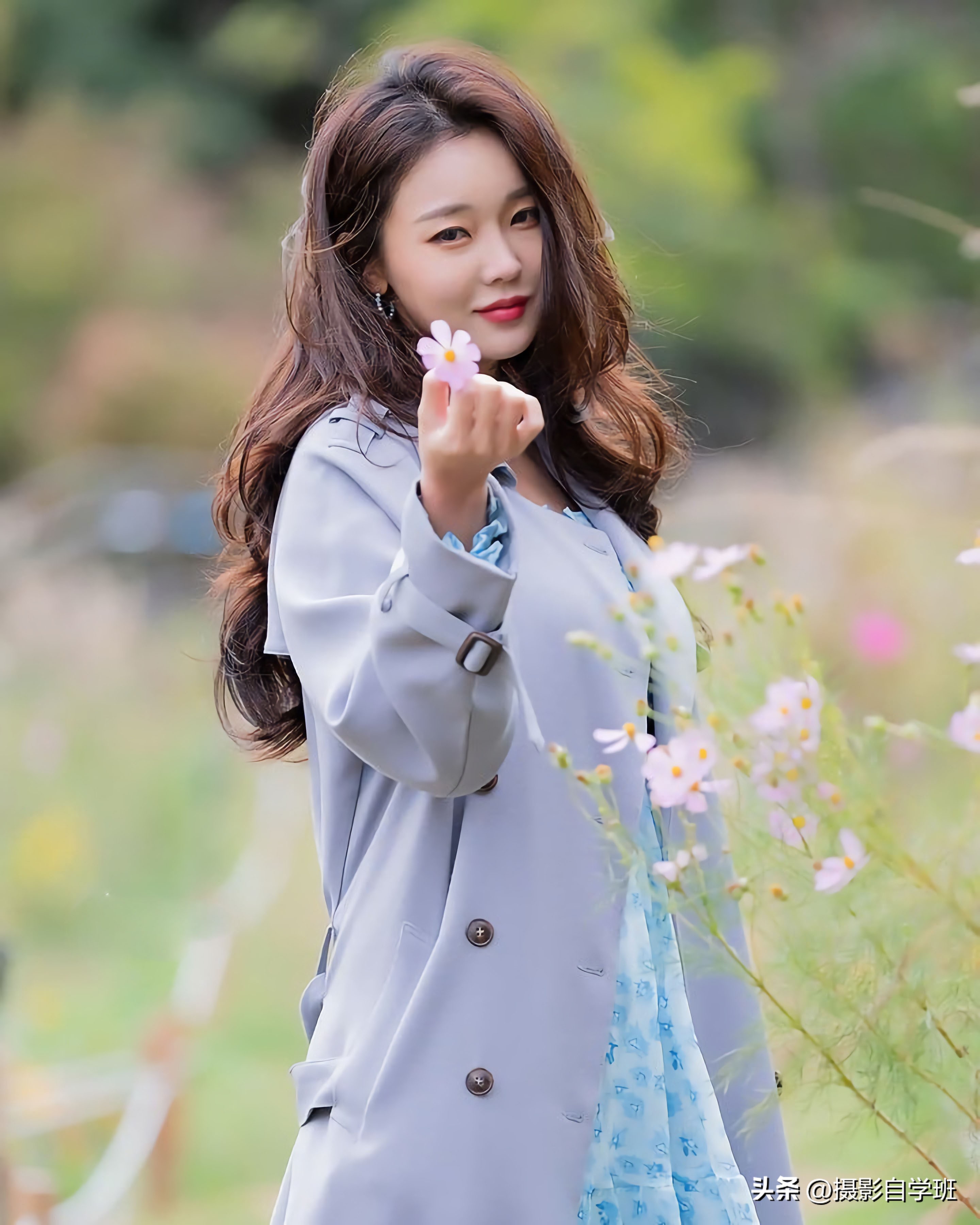 想要让被拍摄的人,姿势不尴尬,而且更加优美,最简单的方法,就是让被拍摄的人,像图2与图3这样,动起来。在不损坏公物的情况下,可以摘一朵路边的野花,冲着这个镜头伸出花朵。