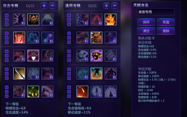 ,肉攻流觉醒如上,5血2护甲2攻3穿透,也可以4血2护甲1魔抗3穿透,天赋上在攻击专精上点出了力量催生,这样每级的攻击成长正好达到了4,一点都不浪费,通用跟攻击专精点出了双移速,因为我是个喜欢攻的人,身为攻自然就是要快了嘿嘿,当然啦也可以吧移速点成护甲跟组织再生都是可以的,接下来我们说说肉觉醒的夜夜,相对的这类夜夜就是相对伤害较低的一类了,需要正确出装才能打出