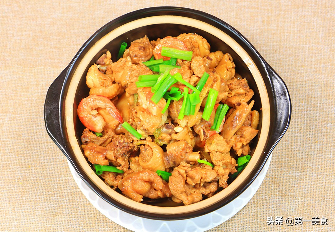 20分钟以后,倒入煎好的大虾翻炒一会儿,大虾入味以后即可出锅,把鸡块和大虾一起盛放在砂锅里面,再撒上葱段,美味即成。