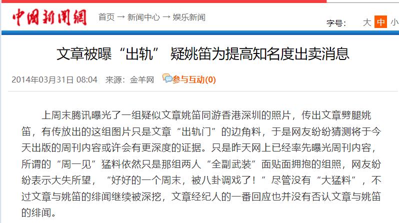 金羊网:文章被曝“出轨” 疑姚笛为提高知名度出卖消息