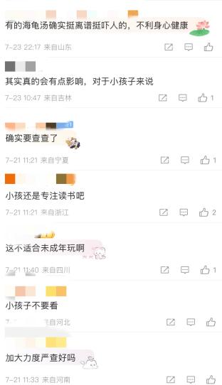 法治网记者注意到,有不少网友反映,“海龟汤”其中的一些内容充斥着血腥、暴力元素,对未成年人的身心健康可能造成不良影响,还有网友呼吁相关部门对其进行严查。
