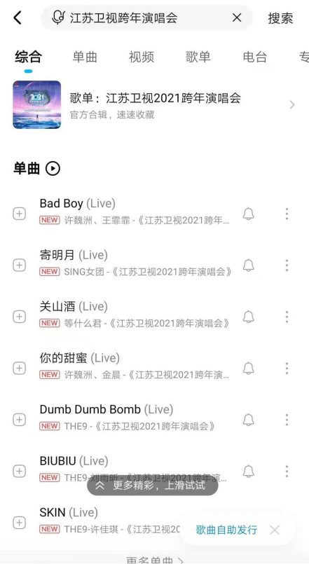 12月31日,江苏卫视“用奋斗点亮幸福”2021年跨年晚会在万众期待下,以“顶级舞美+真唱联盟+超强嘉宾阵容”,引爆2020年最后一个夜晚。当晚,华语乐坛实力唱将、新生代顶流偶像、中国风实力音乐人全员出动,张杰、薛之谦、周笔畅、THE9、SING女团、等什么君等炸裂登场。酷狗音乐第一时间同步将整场歌单的高清音源,全部零时差上线,为粉丝延续这场音乐盛宴带来的快乐,这么好听的现场刷N+1遍都不会腻~