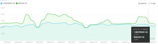 数据显示,番茄(下文将番茄免费小说简写为番茄)的搜索指数全面超过七猫(下文将七猫免费小说简写为七猫),可一定程度反应番茄的流量比七猫的高。但是七猫的各项比值都在上升,整体态势较好,反观番茄则是各项比值上升较慢,甚至出现下降。