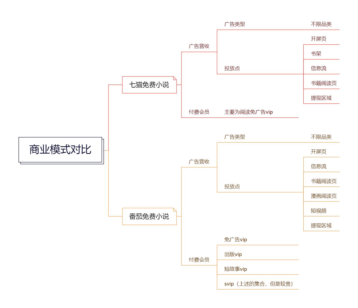 由下图可知,七猫与番茄的商业模式大致相同,都通过广告与付费会员进行营收,但是七猫的业务明显比番茄少,番茄除了书籍阅读外,还有漫画阅读以及短视频业务。这也可看出番茄的整体体系比七猫更加完善。