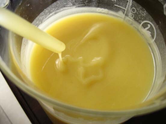 接下来就可以将皂液倒入模具了,如果没有模具也可以使用牛奶盒制作。入模后大约半天的时间皂就有一些硬度了,就可以开始脱模了