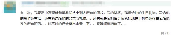 有一次,我无意中发现爸爸留着我从小到大所有的照片,我的奖状,我送给他的生日礼物,写给他的贺卡还有信,还有我送给他的父亲节礼物。我妈告诉我,我爸现在手机里还存着我给他发的所有短信,时不时还会拿出来看一下。