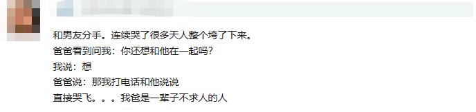 我爸是一辈子不求人的人。但之前我和男友分手,我连续哭了很多天,人整个垮了下来。 爸爸看到问我:“你还想和他在一起吗? ”我说想,然后爸爸说:“那我打电话和他说说。”
