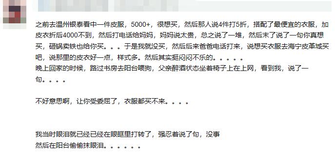 之前去温州银泰看中一件五千多的皮衣,很想买,然后那人说4件打5折,搭配了最便宜的衣服,加皮衣折后4000不到。我打电话给妈妈,她觉得太贵,说了一堆,末了说了一句“你真想买,砸锅卖铁也给你买”。于是我就没买。后来爸爸打来电话,说想买衣服去海宁皮革城买吧,那里的皮衣好一点,样式多。我其实挺闷闷不乐的,晚上回家的时候,我路过书房去阳台喂狗,父亲醉酒状态坐在椅子上在上网,看到我,说了一句:不好意思啊,让你受委屈了,衣服都买不来。” 我当时眼泪就已经已经在眼眶里打转了,强忍着说了句“没事”,然后在阳台偷偷抹眼泪。