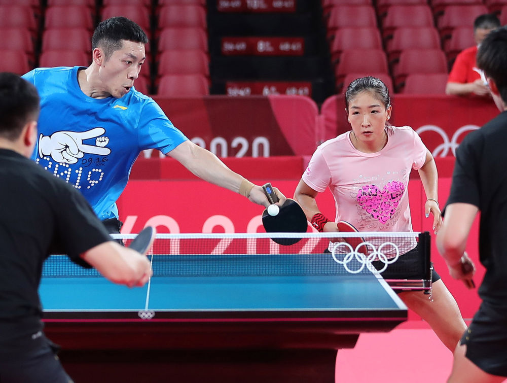 ↑刘诗雯(右二)、许昕(左二)和王楚钦(右一)、梁靖崑在训练中。