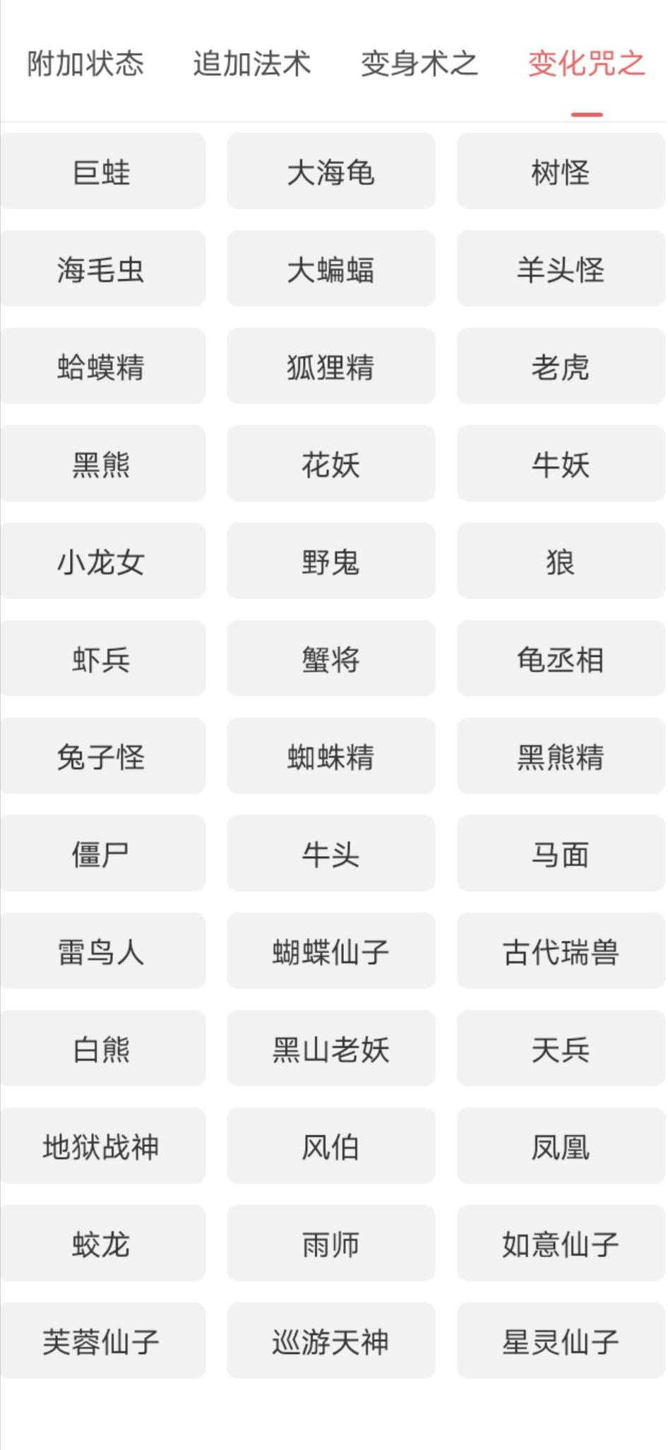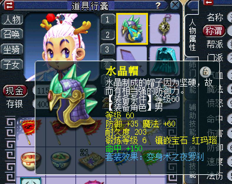 3、变身术套装:令佩带者的某项角色属性额外增强,并在战斗中有一定几率变身为某种召唤兽,获得该类召唤兽变身卡的效果。 5件套装进入战斗后的变身几率比3件套装高,且增加的临时属性点也更多。