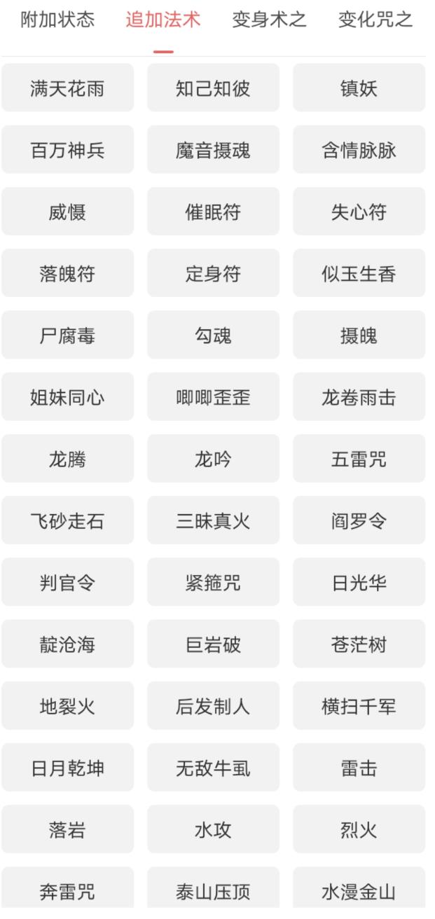 2、追加法术套装:使用普通物理攻击并且命中目标时,有一定几率自动追加某种法术,如自动追加龙卷雨击、似玉生香、横扫千军等门派法术,或落岩、水漫金山等召唤兽法术。