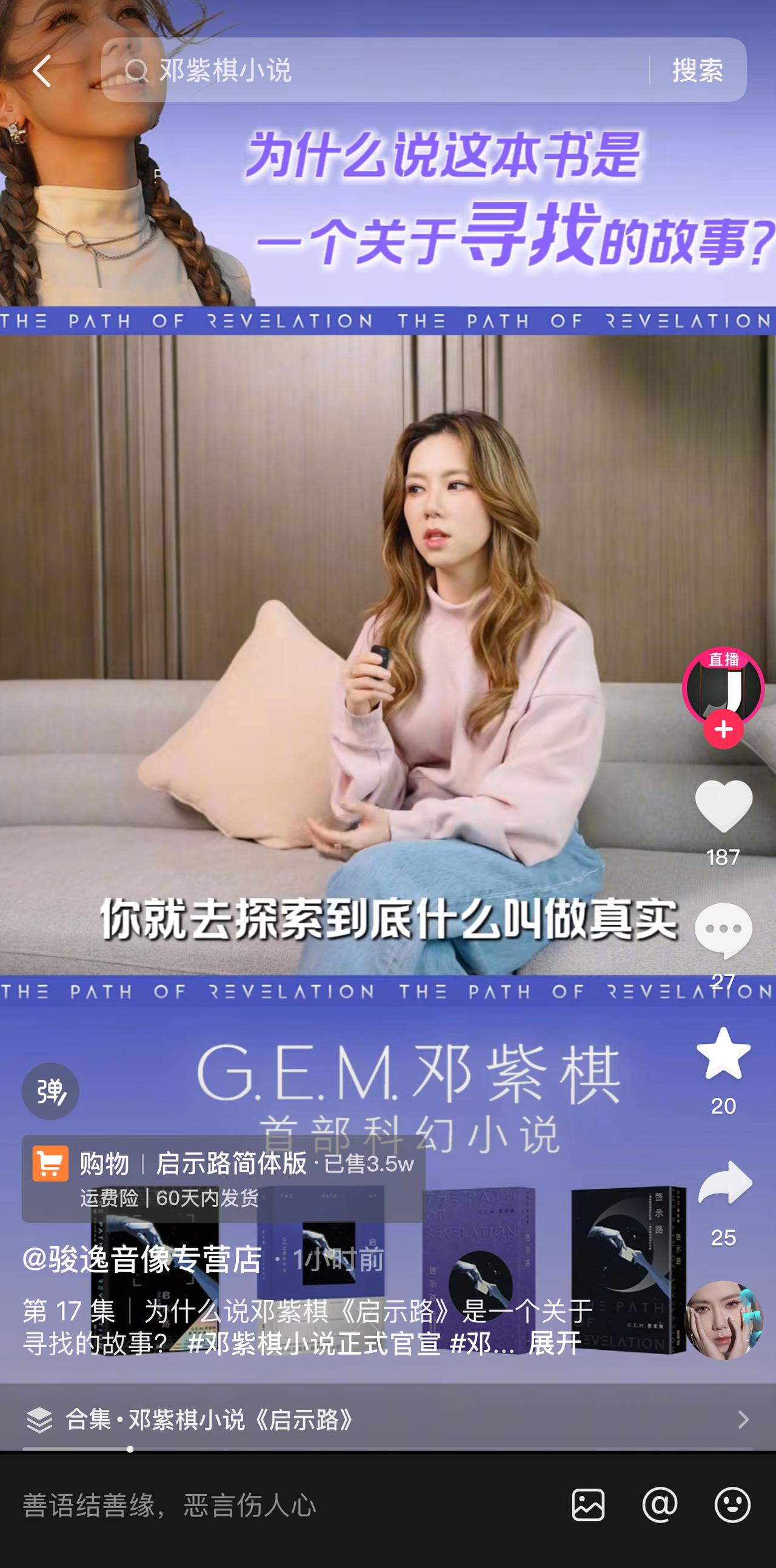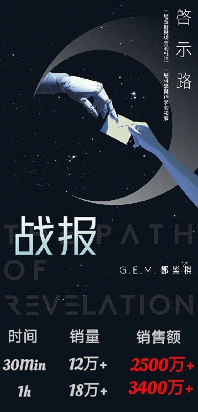 7月10日12点,@GEM鄧紫棋首部长篇科幻小说《启示路》开启预售,一小时销售额超3400万。抖音购物页显示,新书将于60天内发货。