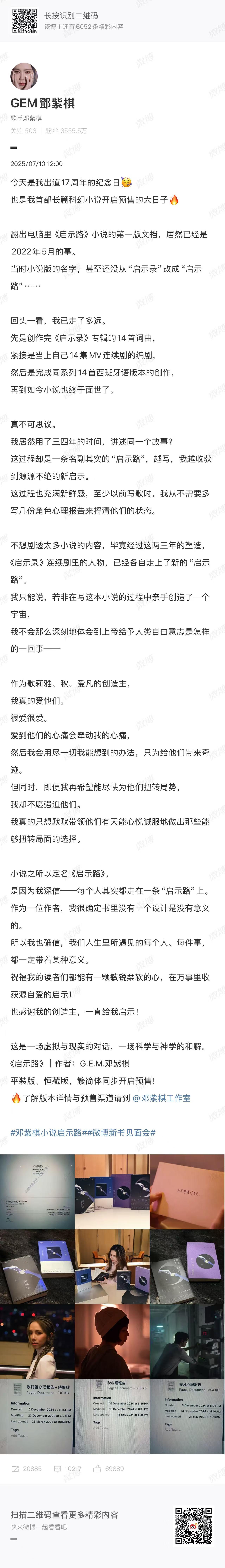 今天也是邓紫棋出道17周年纪念日,无数粉丝送上祝福,庆祝姐姐以作家身份“再出道”。邓紫棋也在微博上用“不可思议”形容自己的创作心路:“我居然用了三四年的时间,讲述同一个故事?这过程却是一条名副其实的‘启示路’,越写,我越收获到源源不绝的新启示。”她也直言,不想剧透太多小说的内容,毕竟经过这两三年的塑造,《启示录》连续剧里的人物,已经各自走上了新的“启示路”。