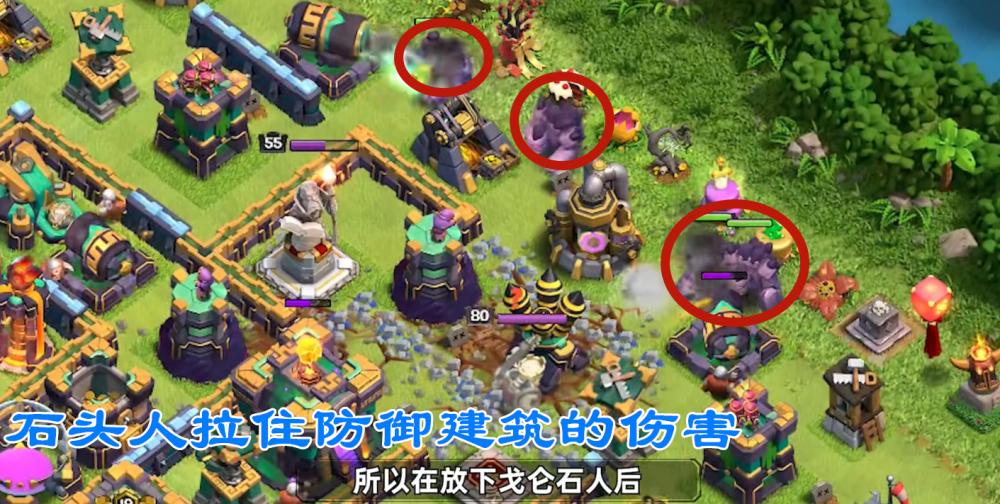 当城墙被打开以后,先要释放“石头人”目的就是拉住防御建筑的伤害,当然了这也是“石头人”为什么会出现在这个流派的目的,就是为大部队吸引伤害保证后面“输出”部队的安全。