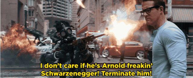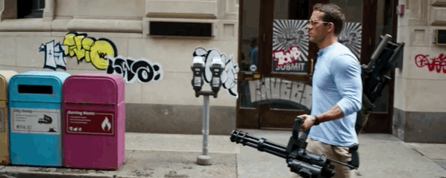 盖在片中还掏出了《终结者2》中施瓦辛格的经典武器:加特林机关枪(这段还致敬了小贱贱自己十年前的《绿灯侠》)。