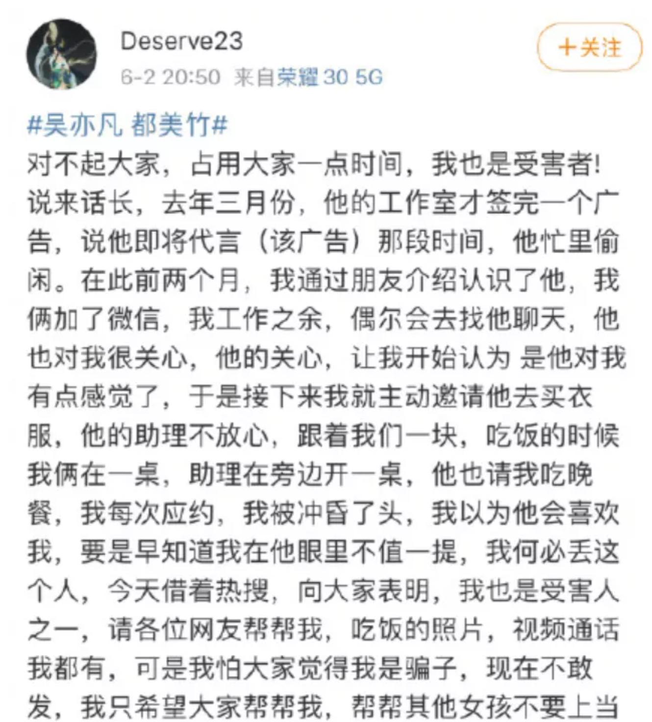 微博名为@Deserve23 表示自己去年3月曾与吴亦凡交往,也是受害者之一。