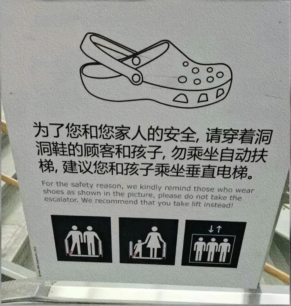 近年来,不少商场都在扶梯附近张贴了安全提醒,建议穿着洞洞鞋的顾客乘坐垂直电梯,以免再次发生意外。