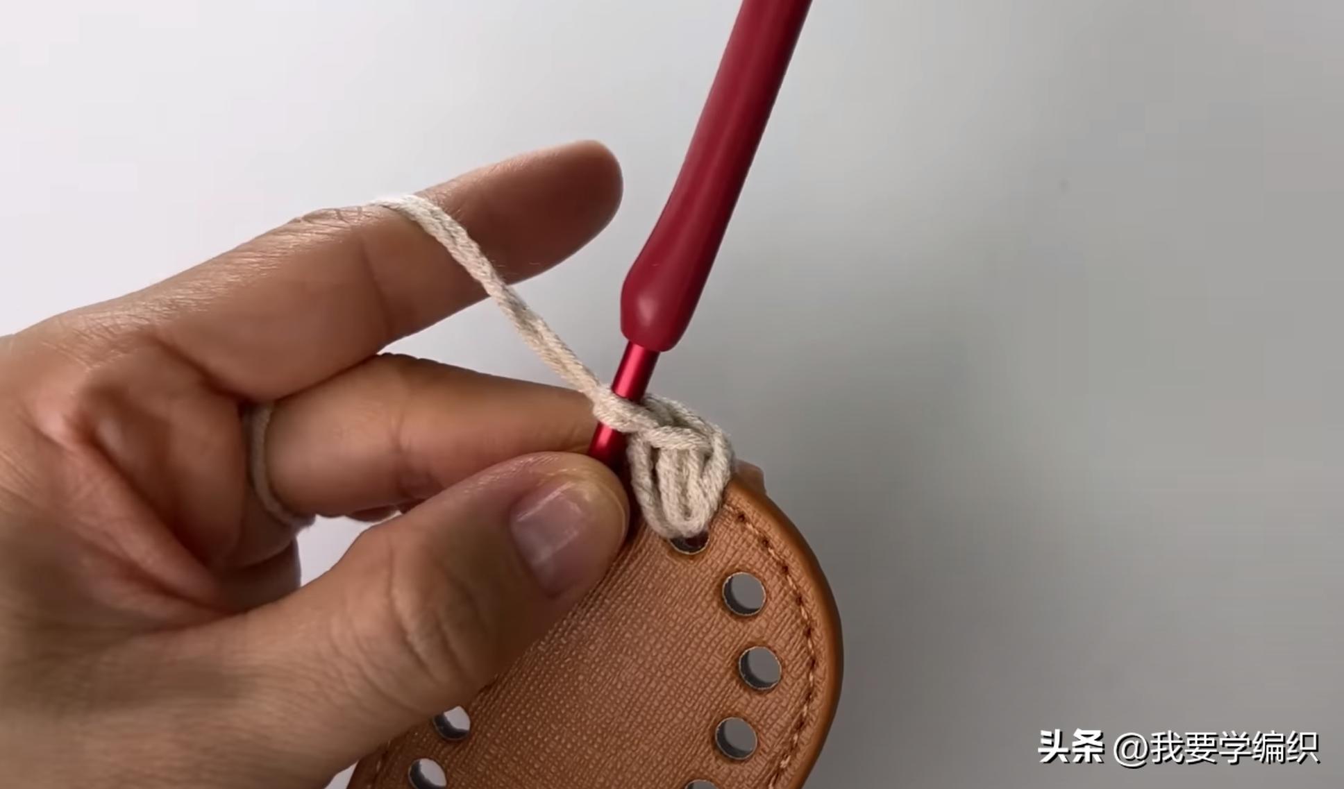 再拿根包带,从没打结的那个侧边开始穿,穿带的方法跟前一根是一致的,一直穿到两头的包带会头时,也同样打个结(即两端都打了结),这样包带就能灵活抽成自己想要的款式了,可抽成手拎款,单肩款,或斜挎款。如果喜欢变幻款式去用的话,这款包包到这里就结束了,如果想把它固定成手拎款的话,我们还要再做最后一步:先调好包带的款式,然后用棉线,从横条包带的下方去穿针(如图),钩一排短针(只钩包带这一段即可),这步完成后,手拎款的绒毛小包就完工啦~!