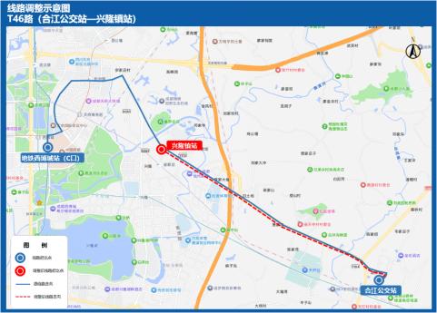 线路走向:去程合江公交站至兴隆镇站线路走向及站点不变;临时取消兴隆镇站至地铁西博城站;返程兴隆镇站至合江公交站线路走向及站点不变,临时取消地铁西博城站至兴隆镇站;