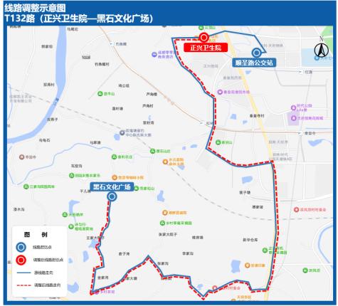 线路走向:去程正兴卫生院站至黑石文化广场线路走向及站点不变,临时取消顺圣路公交站至正兴卫生院站路段;返程黑石文化广场至正兴卫生院站线路走向及站点不变,临时取消正兴卫生院站至顺圣路公交站路段;