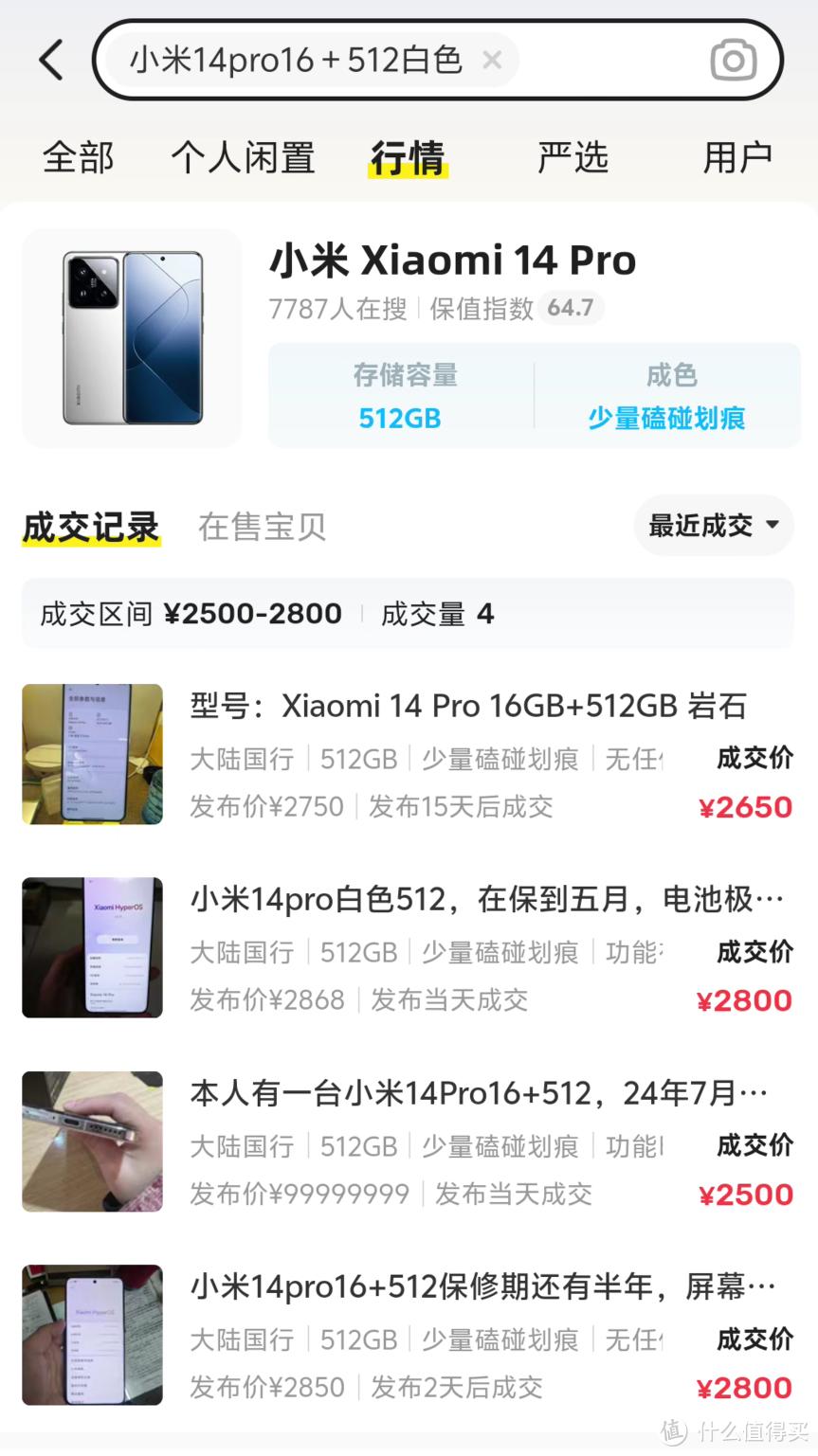 比如小米14Pro的16+512G,闲鱼查询近期成交价2500-2800元,如果你遇到一个1600~2000元这样明显低于成交价,看起来很像是捡漏的,就一定要小心了。