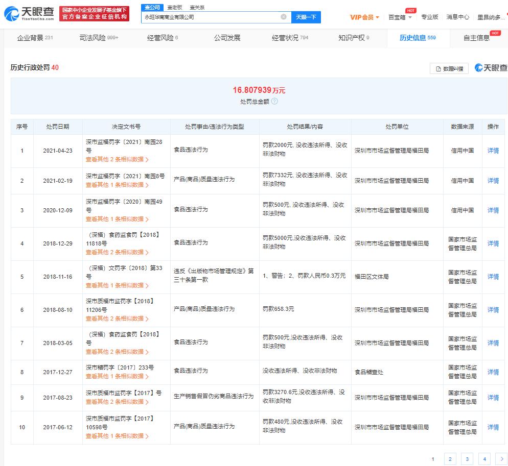 值得一提的是,该公司多次因产品(商品)质量违法行为、食品违法行为被行政处罚,今年1月30日,该公司因产品(商品)质量违法行为被深圳市市场监督管理局福田监管局处罚。