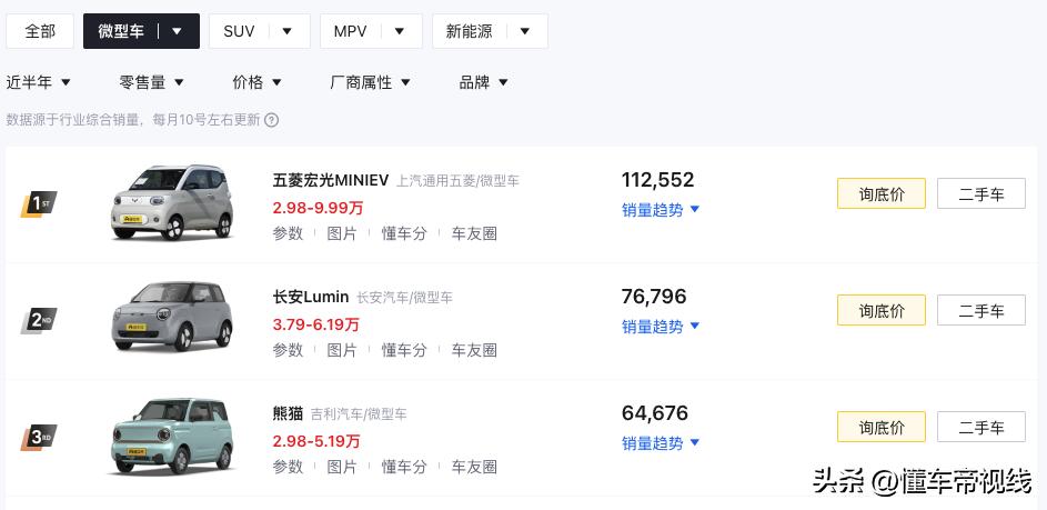 根据懂车帝销量排行榜显示,吉利熊猫系列车型近半年累计销量约为6.4万辆,在双门微型电动车市场内仅次于五菱宏光MINIEV、长安Lumin,主要竞争对手还包括奇瑞QQ冰淇淋、奇瑞小蚂蚁、东风风光MINIEV等车型。