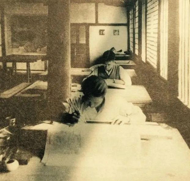 △梁思成先生(后)与莫宗江先生在李庄营造学社绘图场景 ©清华大学建筑学院中国营造学社纪念馆