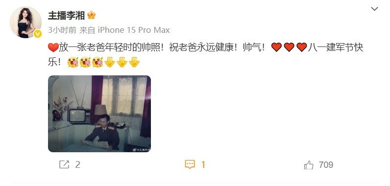 对此李湘却没有动静,直到建军节的时候,李湘才发布了一张自己父亲穿着军装的照片,并祝福大家建军节快乐。