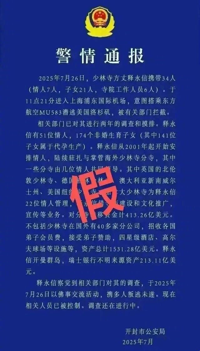 近日,网络上流传出一张关于释永信的通报,该通报称释永信被调查出有51名情人,174个非婚生育子女,还有则是侵占了寺院几百亿美元。