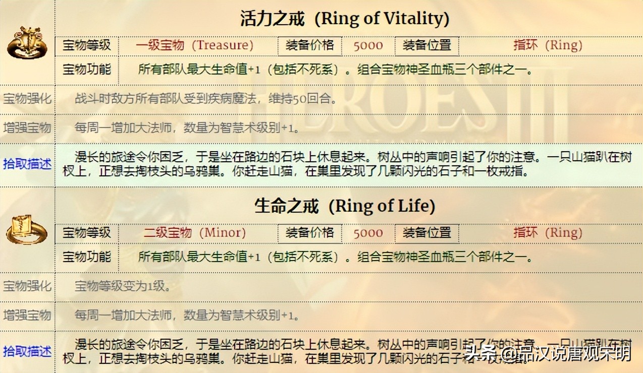 比较奇怪的是,这类增强部队属性的宝物等级比较混乱,例如活力之戒的等级是1,生命值+1点,而生命之戒的等级是2,生命值也是+1点。