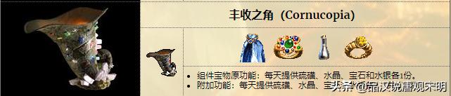丰收之角:每天增加硫磺、水晶、宝石和水银各3份的额外产出。