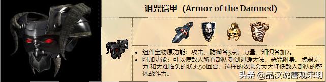 诅咒铠甲:攻防+3;力量和知识+2;战斗开始后释放迟缓、恶咒、虚弱和大难临头,持续50回合。